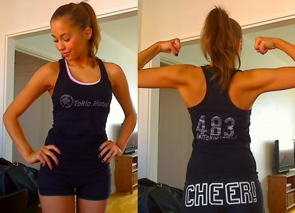 Mitt snygga TH-linne är på och så är även mina urgamla cheer-shorts. Nu ska jag möta upp Tyra för att bygga lite muskler på Balance! Vi ska köra styrka och boxning. Kameran hänger med så jag lovar att ta någon bild och kanske spela in någon videoblogg. Typ hejhej här står vi och kan knappt andas! ;-)